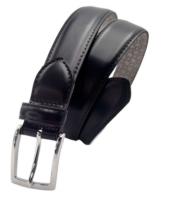 32mm belt with size shortening system and shiny nickel buckle, in hand-polished Flotantic leather with contour stitching. Made in Spain.