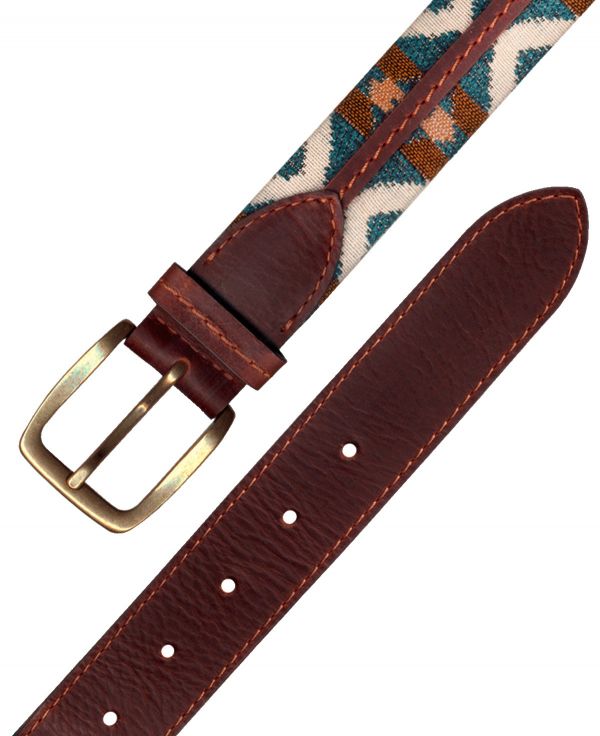 Belt in 35mm with strip in Jaquard fabric with suggestive weave and leather fringe. Genuine oiled cow leather with classic buckle in antique gold finish.