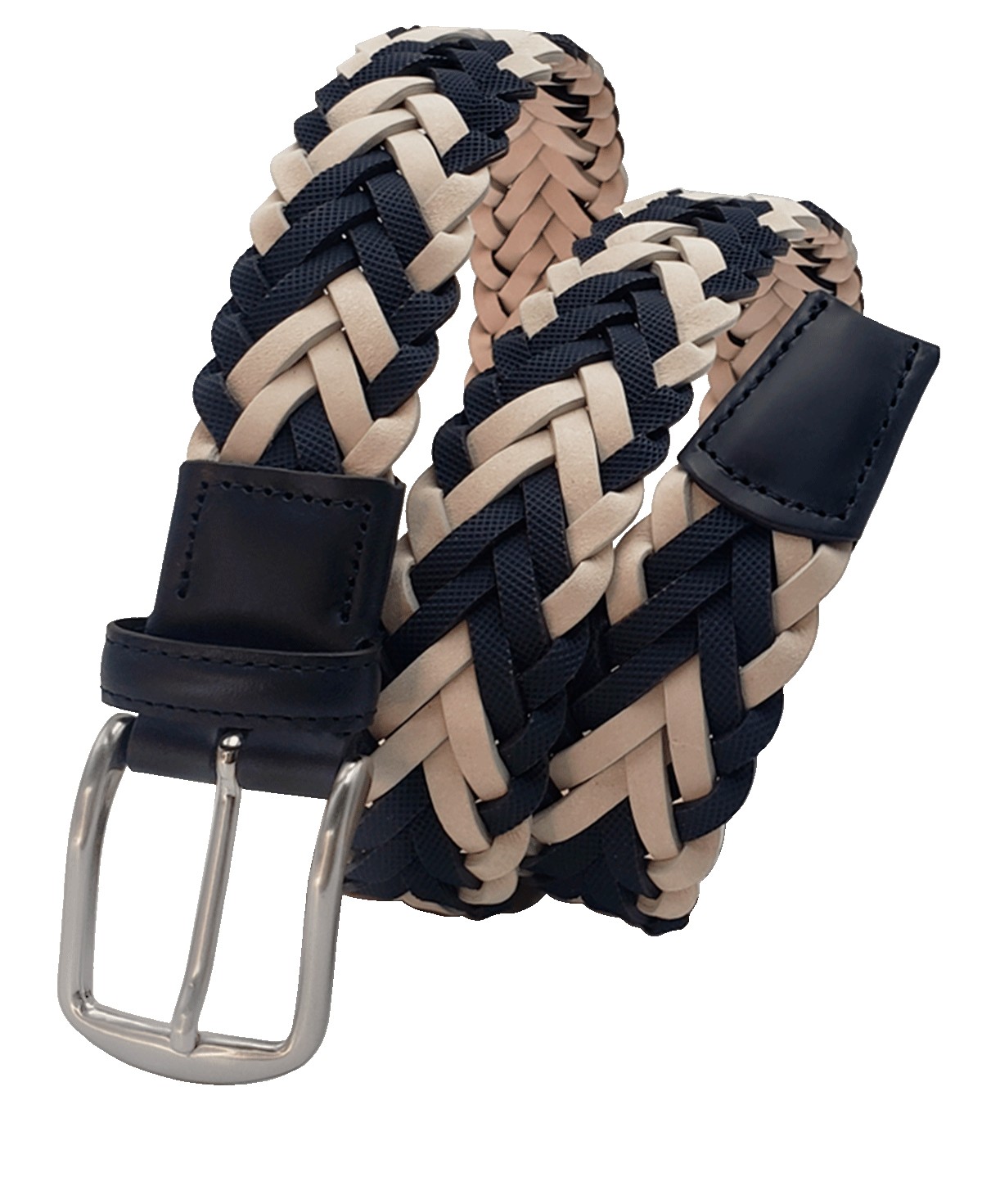 35mm braided belt combining technical material with soft off-white nubuck, finished with a navy full-grain leather tip and keeper. Curved-profile buckle in satin nickel finish.