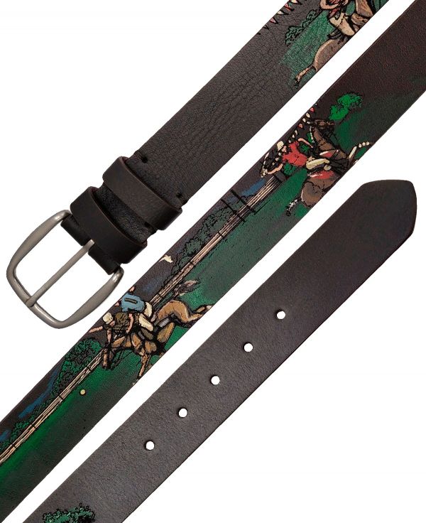 40mm belt from the DESIGNER’S COLLECTION, crafted from edge-cut, tumbled national cowhide. Features a polo-themed laser-engraved design with hand-colored detailing. Vintage-style curved buckle in antique metallic grey with wide double keeper. Made in Spain.