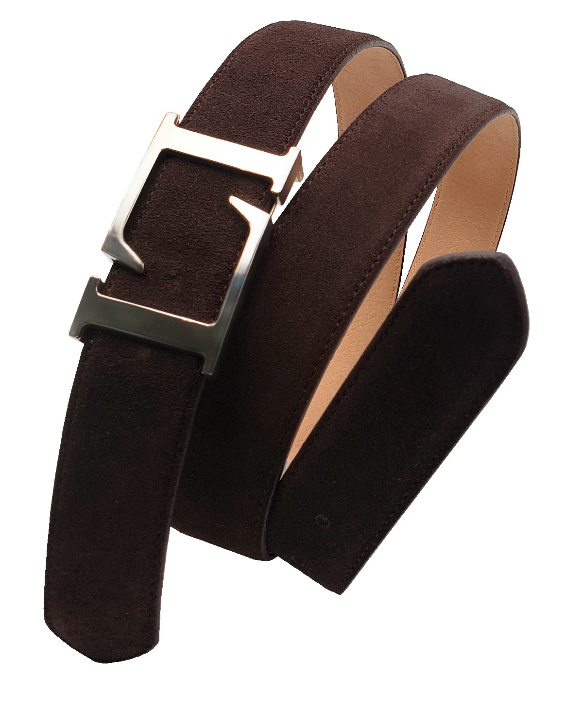 35mm split leather belt with tone-on-tone stitching in selected extra plush split leather. Double L buckle in shiny nickel. Made in Spain.