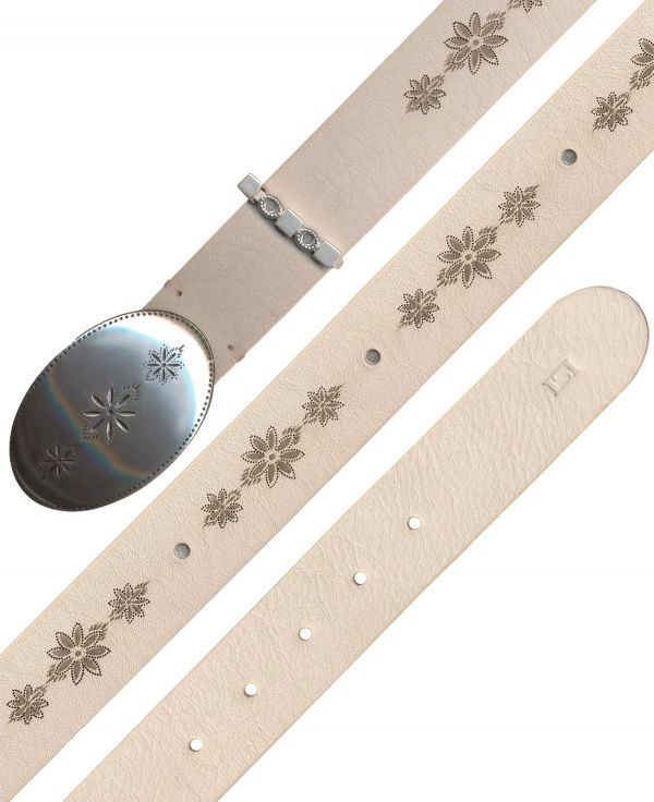 The English silver-finish plaque buckle beautifully echoes the floral theme, creating visual harmony and stylistic coherence. The floral engraving on the buckle perfectly mirrors the motifs on the belt, resulting in an elegant, unified aesthetic.