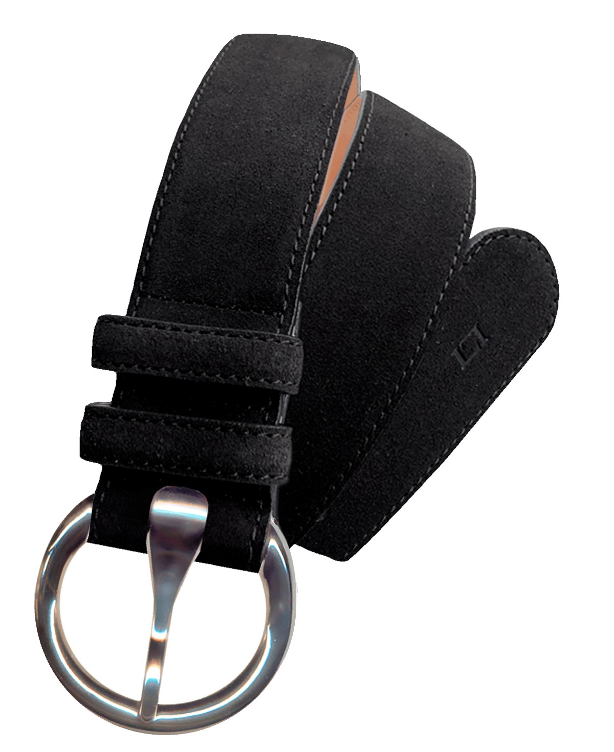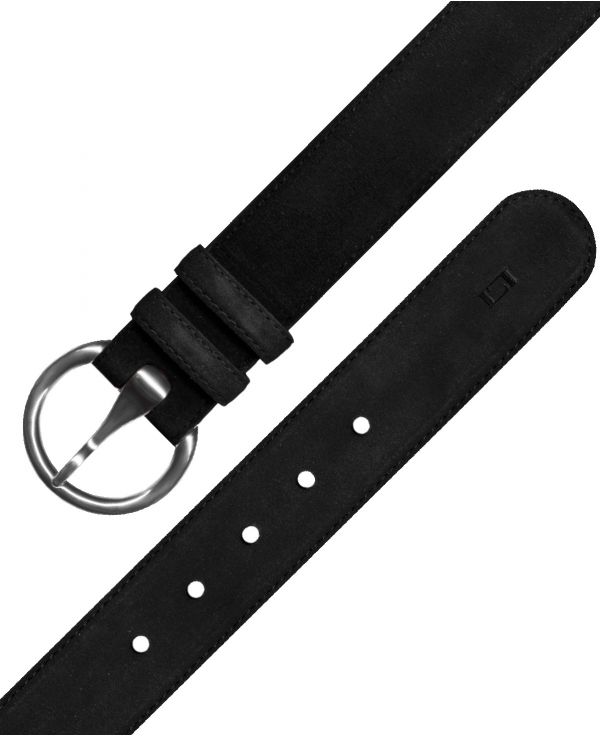 Suede split leather belt in 40mm. Smoothed with tone-on-tone stitching and two pins. Original circular design buckle with shiny silver finish. Made in Spain.