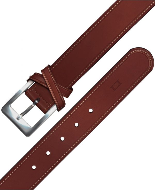 Cowhide belt in 40mm flat with fire fillet and natural stitching. Original shiny silver buckle with crossed pin. Made in Spain.