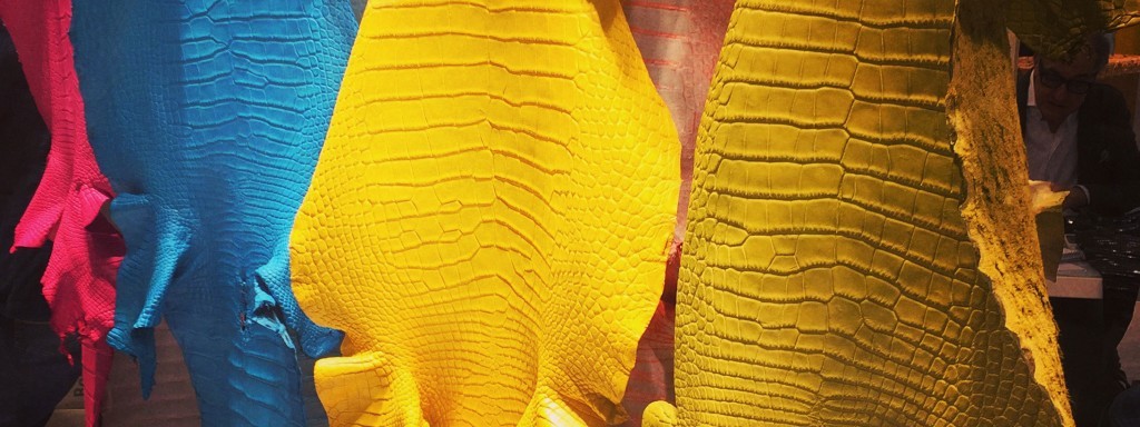 En la foto se puede observar una muestra de las pieles expuestas en Lineapelle y que hemos adquirido. Éstas en cuestión son pieles auténticas de cocodrilo.