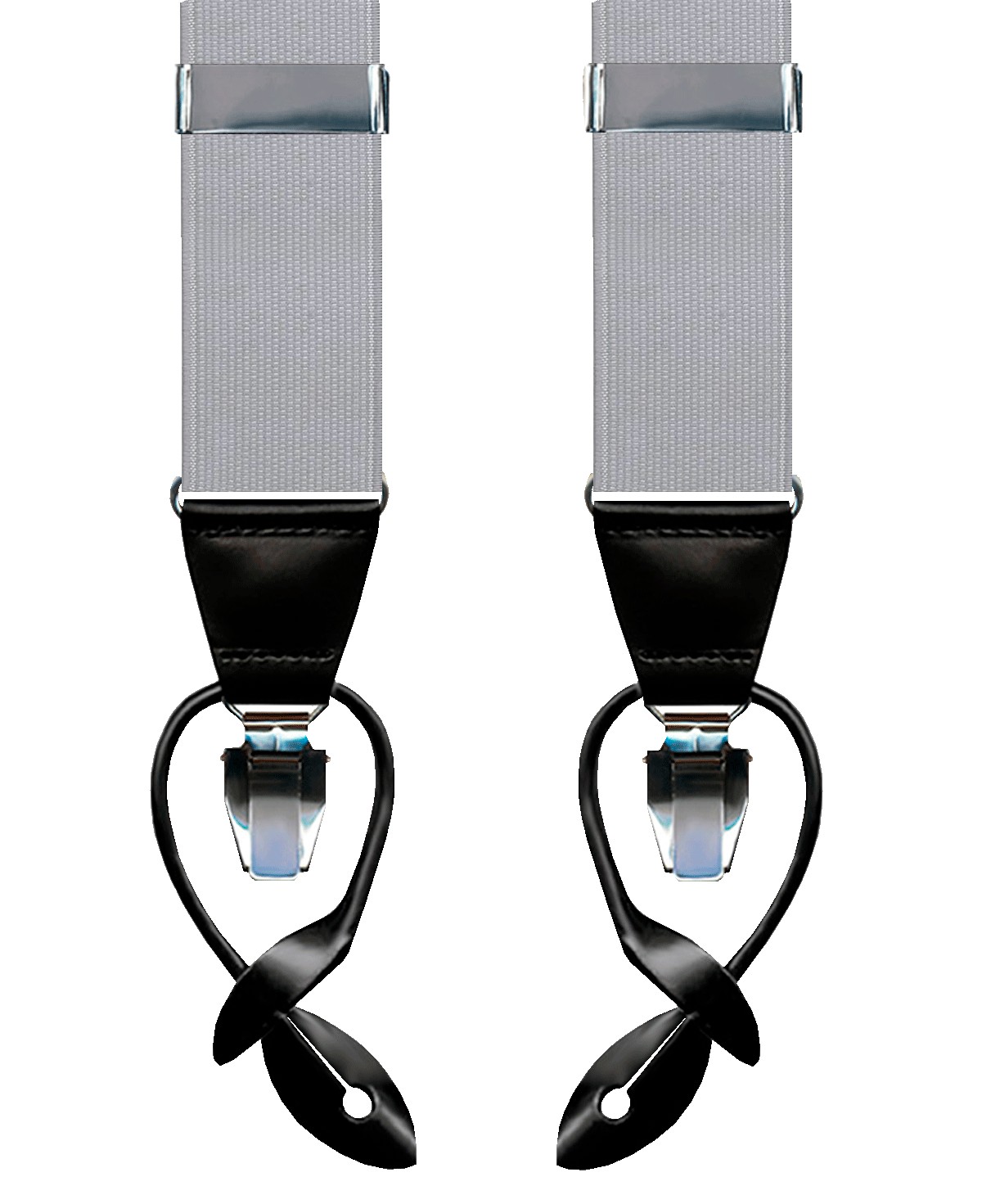 Silver elastic braces with closure system by means of nickel clamp. This elastic strap has a black leather finish. Made in Spain.