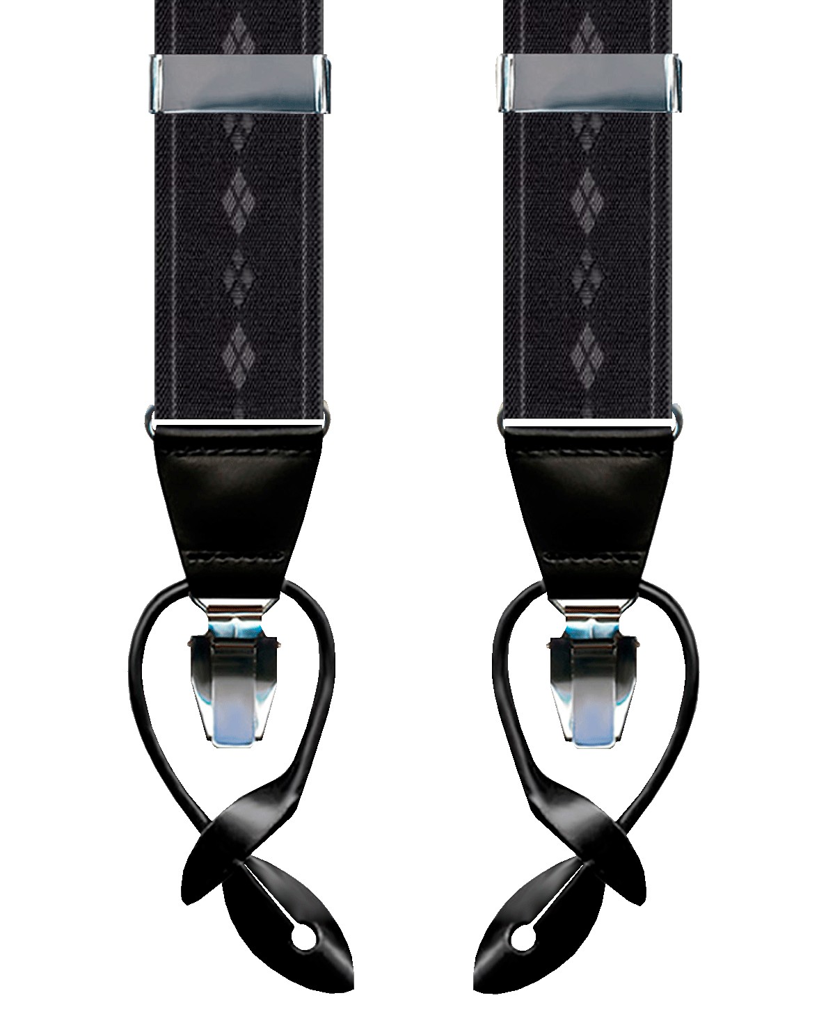 Black elastic braces with diamond pattern and closure system by means of nickel clamp. This elastic strap has a black leather finish. Made in Spain.