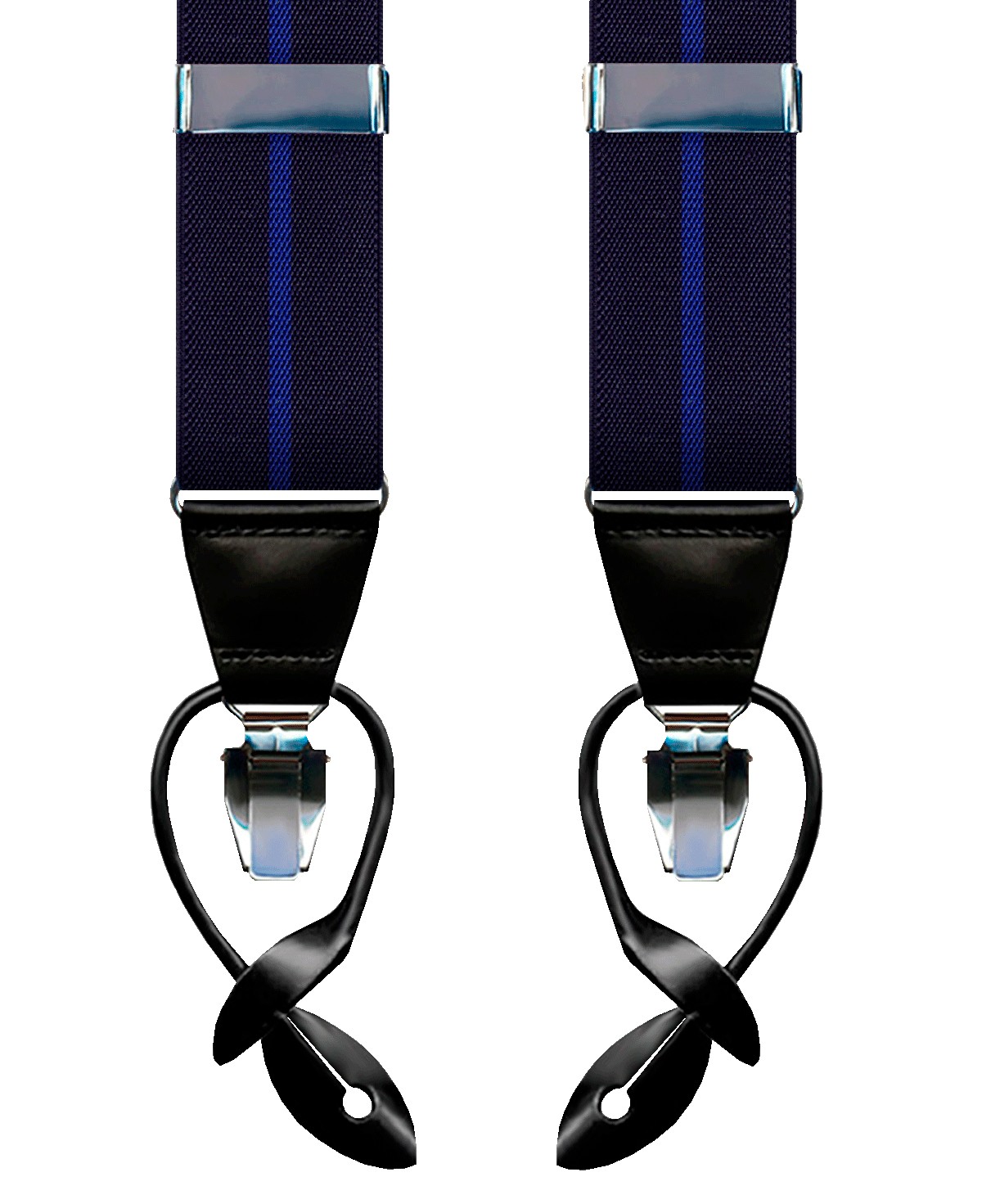 Black elastic braces with blue stripe and closure system by means of nickel clamp. This elastic strap has a black leather finish. Made in Spain.