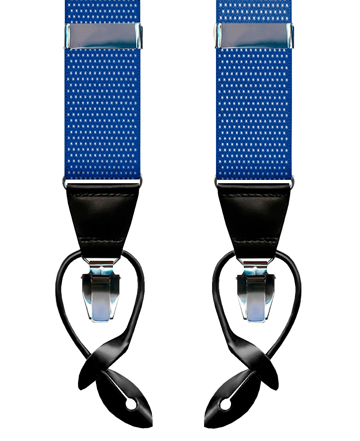 Blue elastic braces with dotted pattern and closure system by means of nickel clamp. This elastic strap has a black leather finish. Made in Spain.