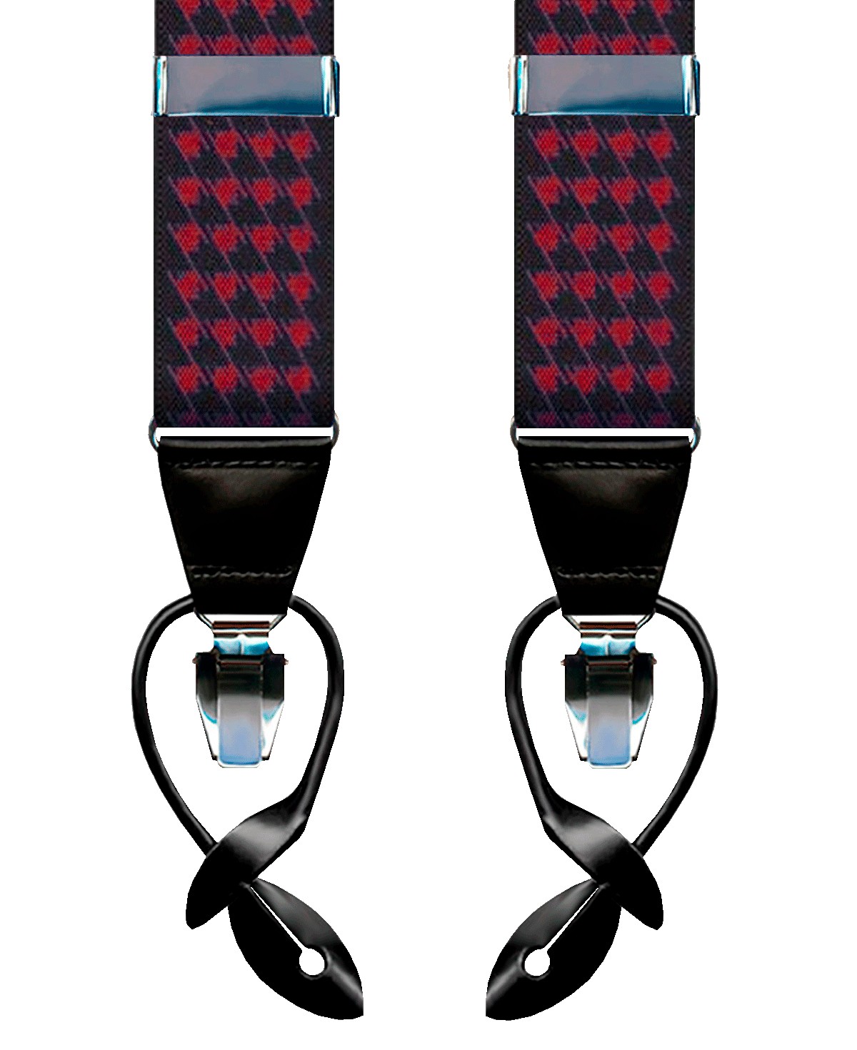 Blue navy and red elastic braces with print and closure system by means of nickel clamp. This elastic strap has a black leather finish. Made in Spain.