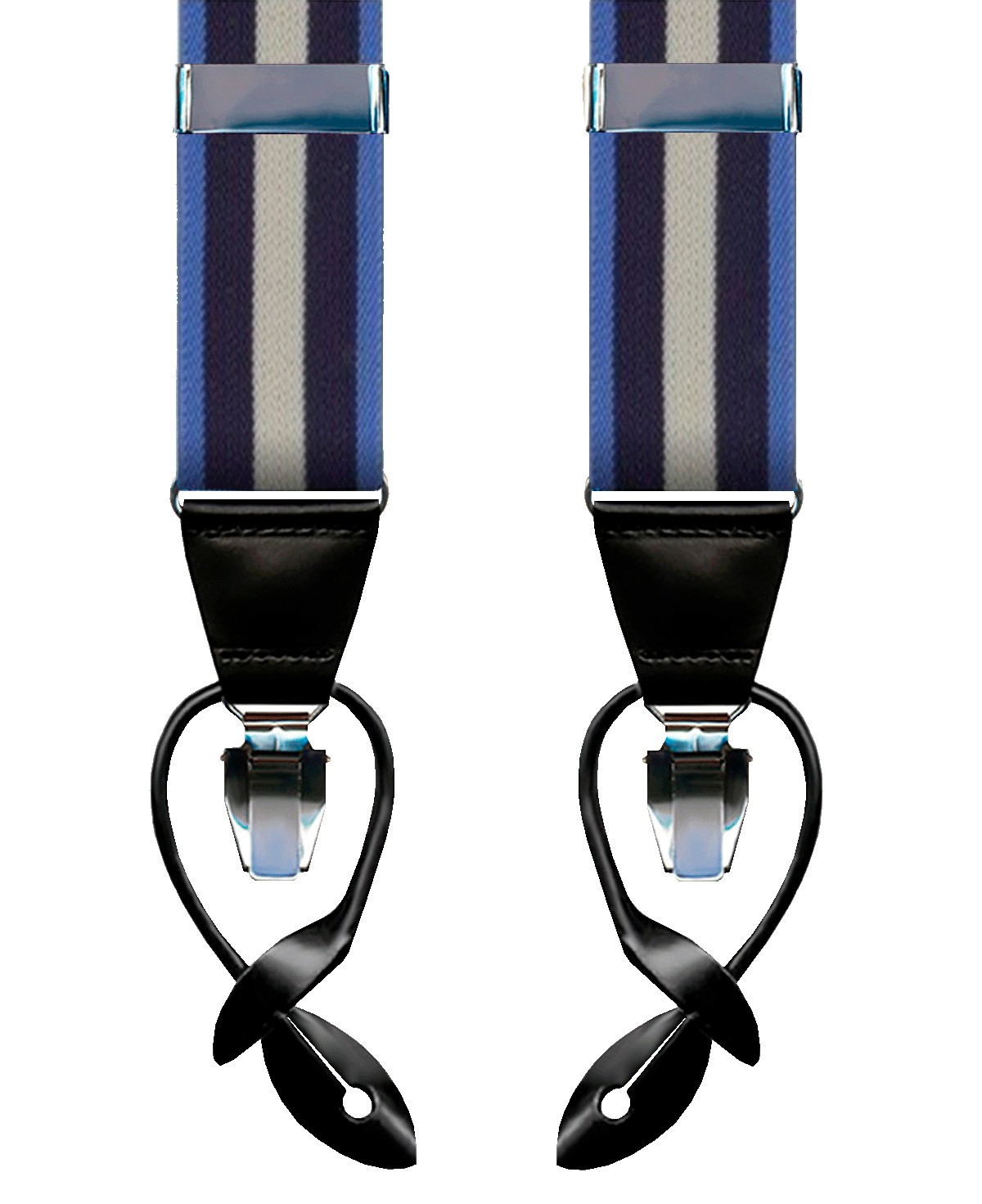 Blue, navy and white striped elastic braces with closure system by means of nickel clamp. This elastic strap has a black leather finish. Made in Spain.