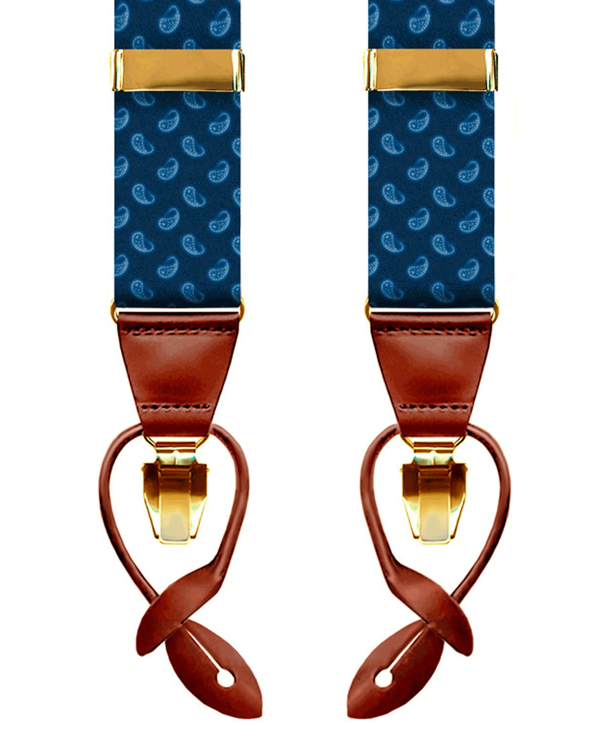 Explore our elegant 35mm Mini Cashmere suspender, made from synthetic semi-sheer fabric. This suspender features a unique design that captures the essence of the English Paisley tradition, with a shower of mini cashmeres in white on a navy blue background.