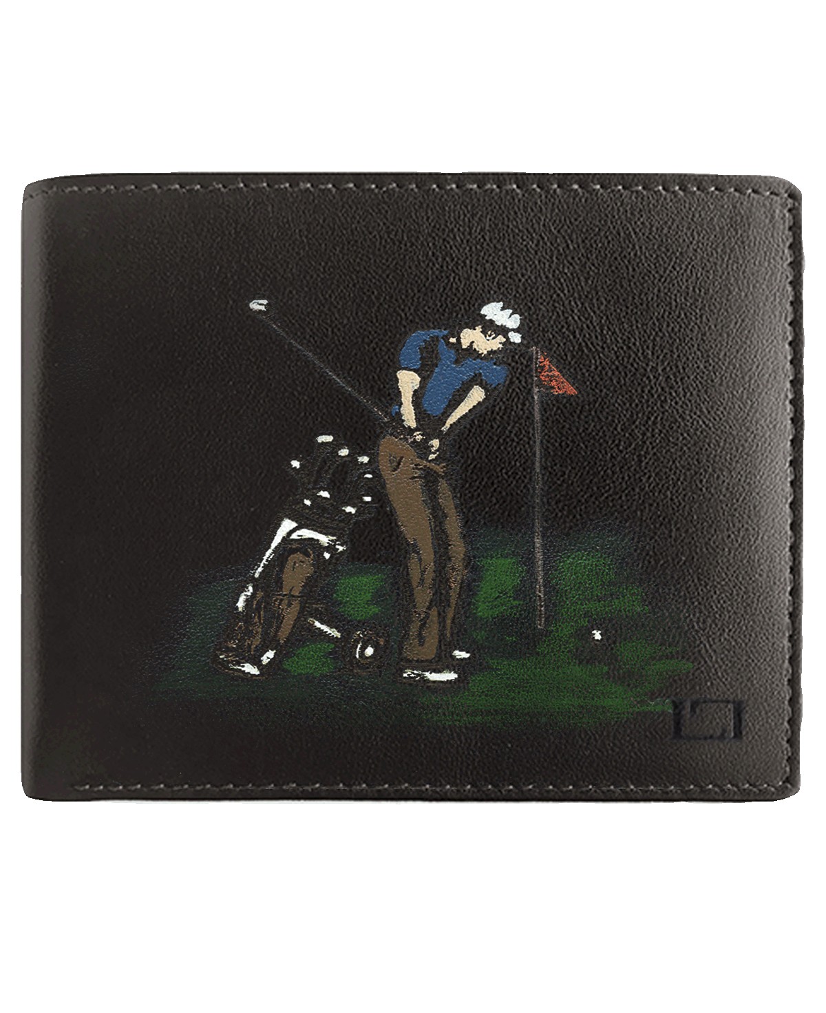 This brown leather wallet combines functionality with an exclusive design featuring a hand-painted engraving of a classic golf scene. Handmade in Spain, it includes five card slots, a practical coin pocket, and a bill compartment, offering the perfect balance of style and practicality. With an interior in blue and burgundy tones and measuring approximately 11.5 cm x 9 cm, this wallet is ideal for golf enthusiasts and those who value high-quality craftsmanship. Each piece is unique thanks to its artisanal finish and detailed engraving.