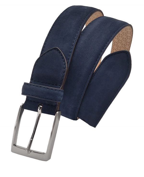 Cinturón clásico alomado en selecto Nobuck con costura tonal al contorno en 35 mm y hebilla en níquel satinado. Dispone de sistema acortable de tallado con tornillo posterior. Forro de Nobuck natural. Fabricado en España.