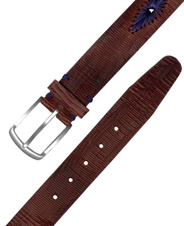 Cinturón al corte en 38mm genuino cuero marrón lijado con líneas rasgadas verticales. Hebilla en Plata inglesa. Presenta labores cosidas artesanalmente con cordón de cola de ratón en azul eléctrico.