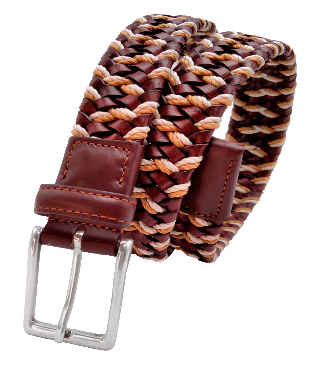 Cinturón trenzado elástico en 35mm en Vacuno combinado con tiras de Algodón. Hebilla rectángular con contorno redondeado en baño de Plata Inglesa.