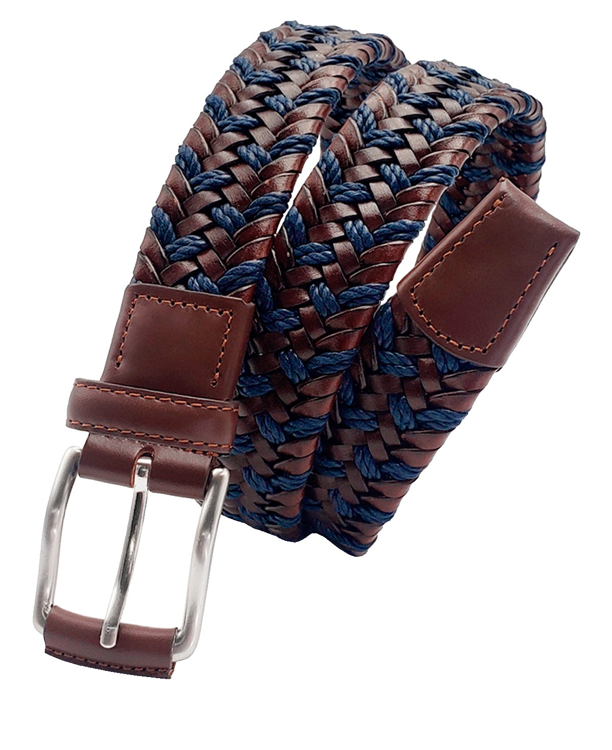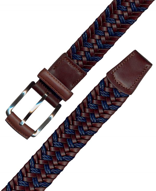 Cinturón trenzado tubular elástico en 35mm combinando tiras de Vacuno con Algodón cerato. Chapa y puntera corta en Vaqueta selecta. Hebilla clásica en Níquel satinado forrada.