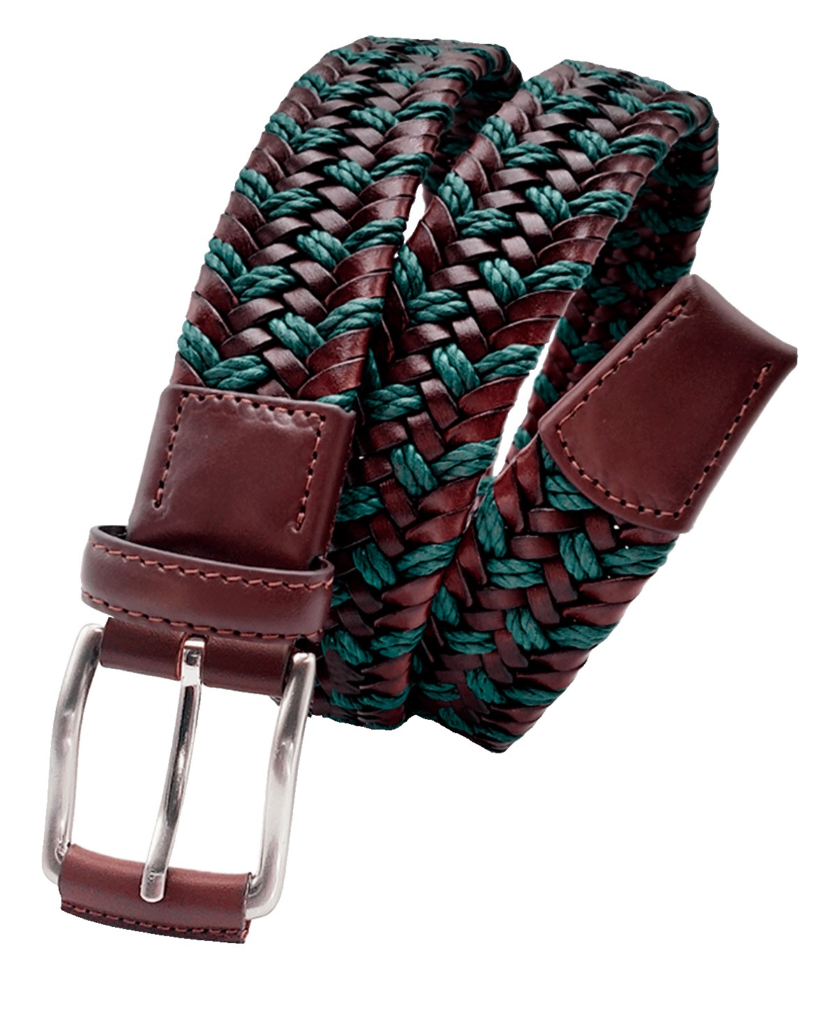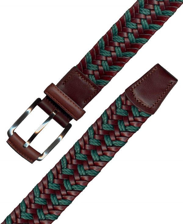 Cinturón trenzado tubular elástico en 35mm combinando tiras de Vacuno con Algodón cerato. Chapa y puntera corta en Vaqueta selecta. Hebilla clásica en Níquel satinado forrada.
