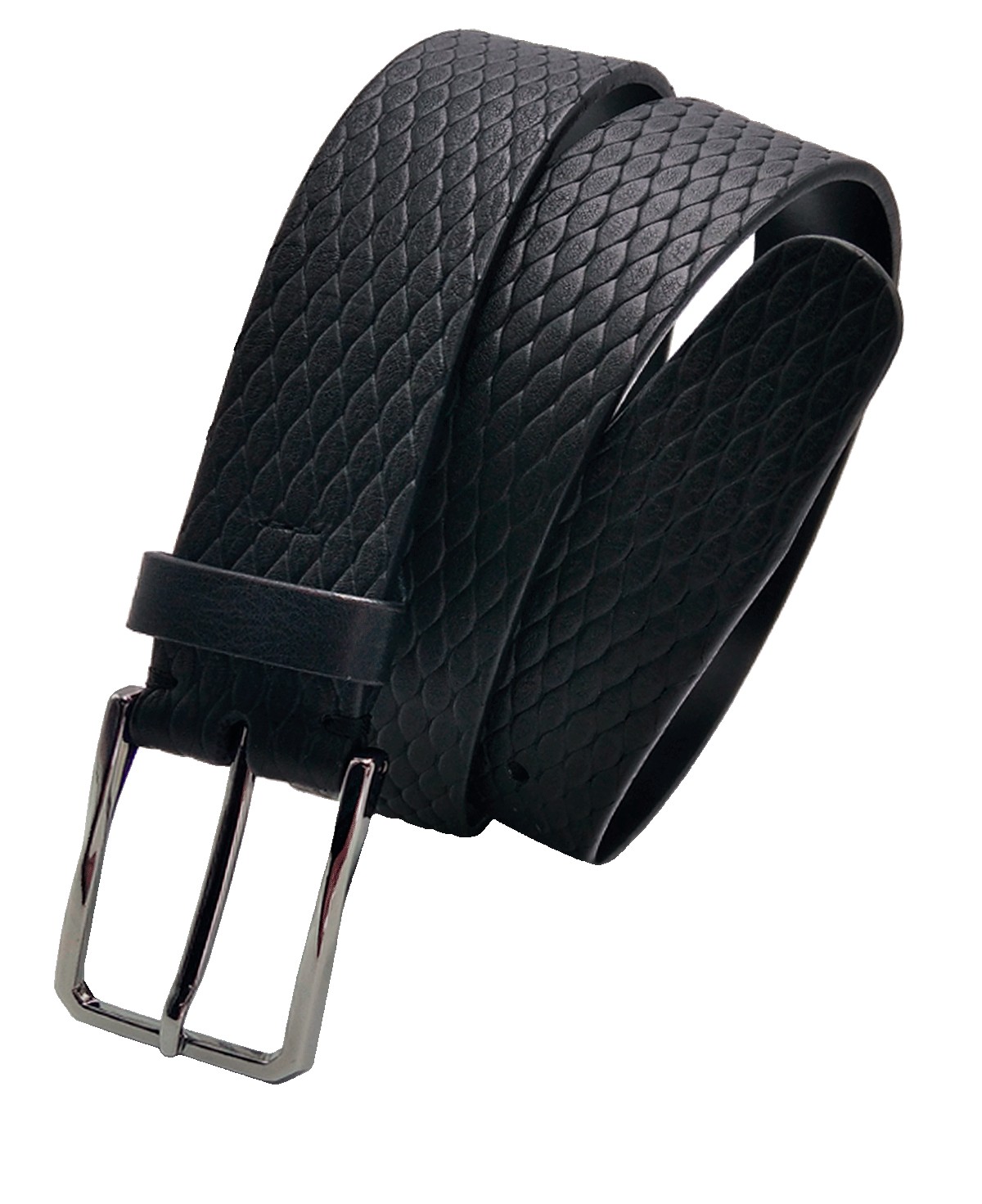 Cinturón en 35mm plano en napa negra, marcada a fuego con patrón original que aporta relieve de escamas al cuero. Hebilla de cantos geométrico de procedencia italiana con acabado de caña fusile.