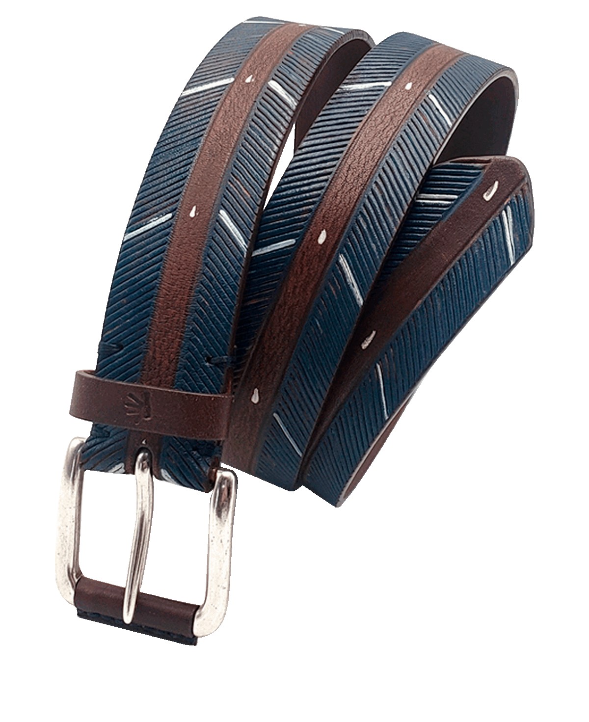 El cinturón ChevronSplit, de 40 mm de ancho, está confeccionado en cuero abatanado en clásico coñac al corte con grabado a fuego en ambos laterales. Presenta un patrón Chevron que marca fuertes hendiduras en los extremos y que se parte al centro, dejando la piel intacta sólo subrayada por un fileteado tradicional. La decoración de color se realiza mediante un proceso totalmente artesanal, con pintura acrílica aplicada a mano en un profundo tono marino que realza el relieve. Finas pinceladas de blanco, aplicadas con destreza, insisten en la direccionalidad del diseño, sumando movimiento y soltura al conjunto.