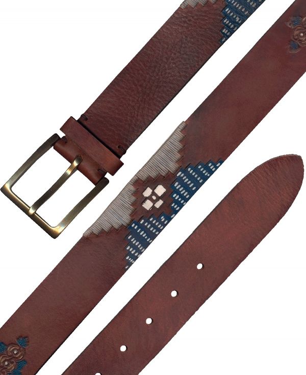 Cinturón en 40mm en vacuno abombado con cortes en superficie que delinean el típico diseño argentino clásico, que se reinventa mezclando pasadas de hilo encerado y pintura. Hebilla clásica en Latón Brillo.
