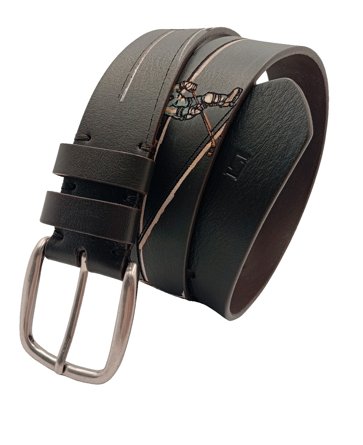 HockeyClub captura toda la intensidad de este deporte sobre hielo, pura adrenalina, emoción y fuerza en cada detalle. Fabricado en vacuno abatanado nacional en un tono marrón intenso, este cinturón de 40 mm de ancho no solo adorna, sino que captura la esencia del juego. El diseño incluye una escena grabada a láser que recorre todo el cinturón, representando una jugada intensa: el choque de jugadores, el movimiento rápido del puck y la tensión de un tiro al gol.