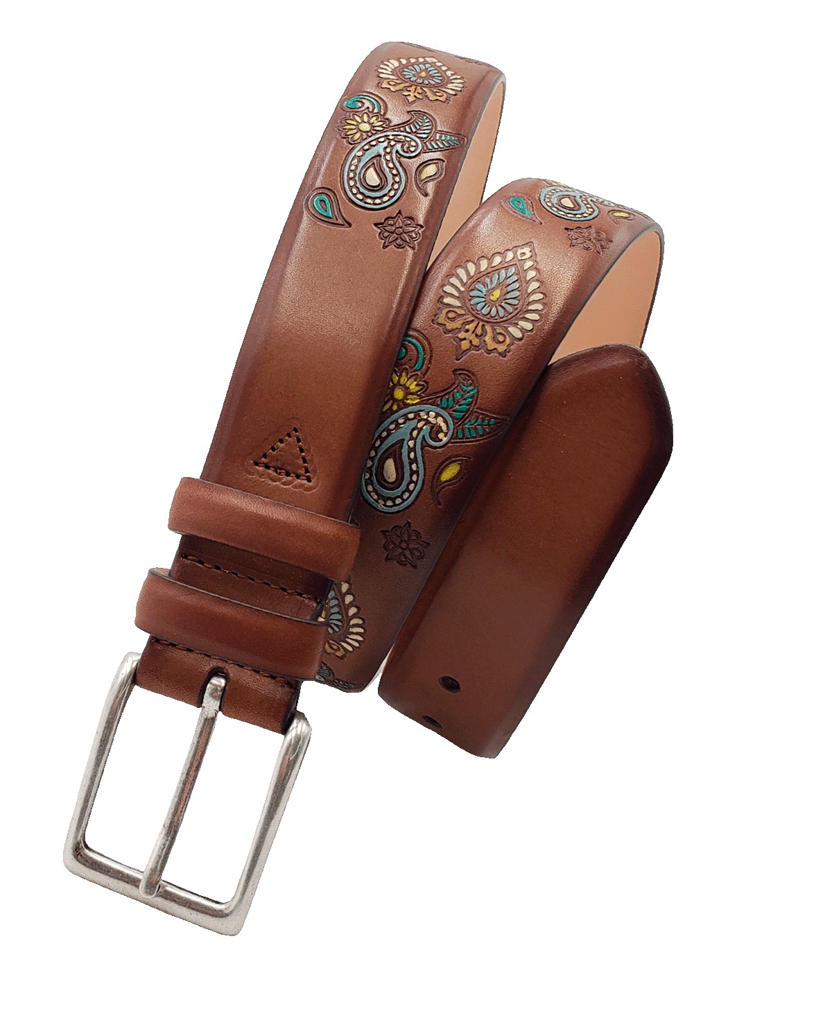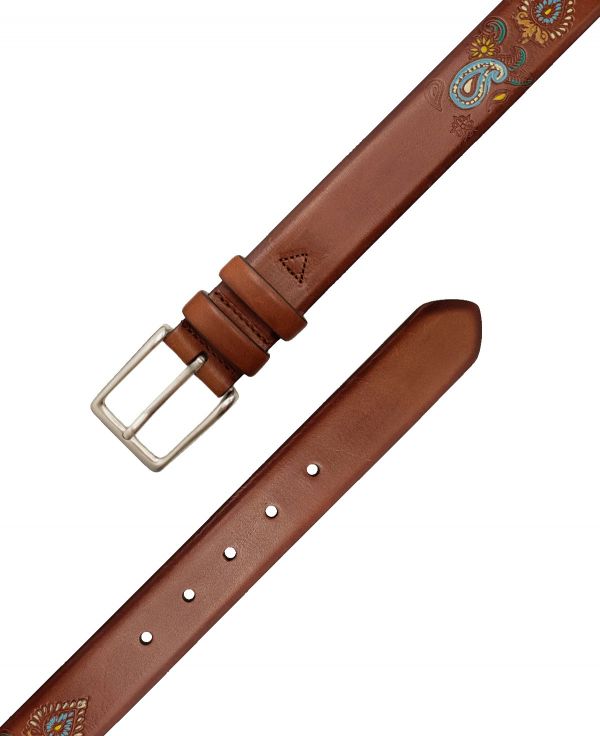 El diseño se completa con un grabado a fuego de patrón Paisley, inspirado en motivos orientales tradicionales, y perfeccionado con un trabajo de coloreado a mano que otorga al cinturón una aura única.