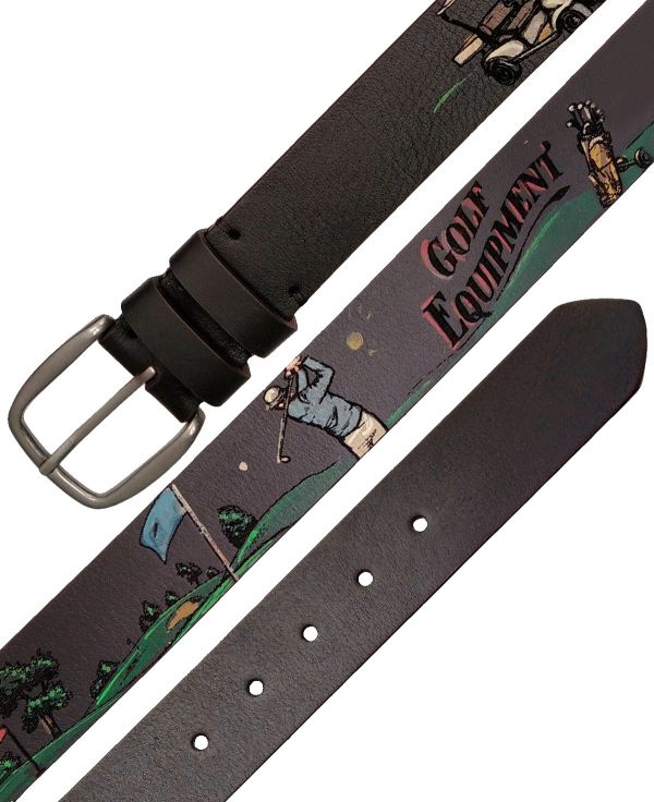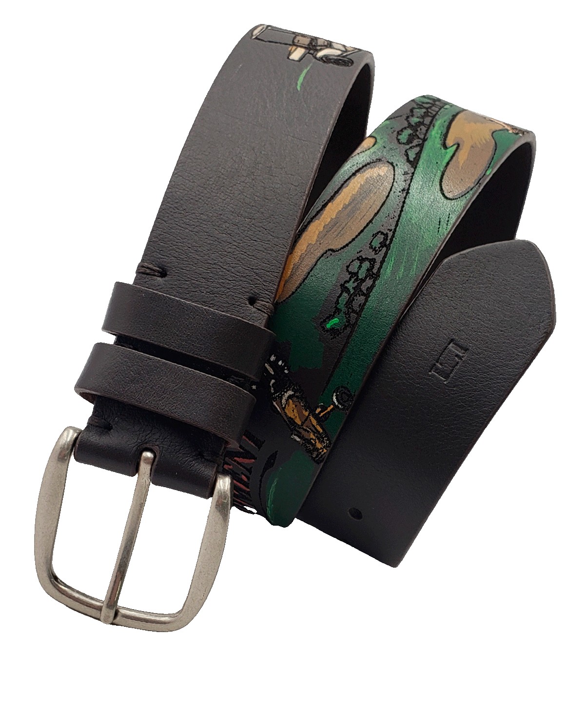 Cinturón en 40mm incluido en DESIGNER´S COLLECTION. Fabricado en Vacuno abatanado nacional al corte, presenta diseño temático deportivo plasmado mediante tecnología láser, y coloreado artesanalmente. Hebilla original curva en acabado vintage y doble pasador ancho. Hecho en España.