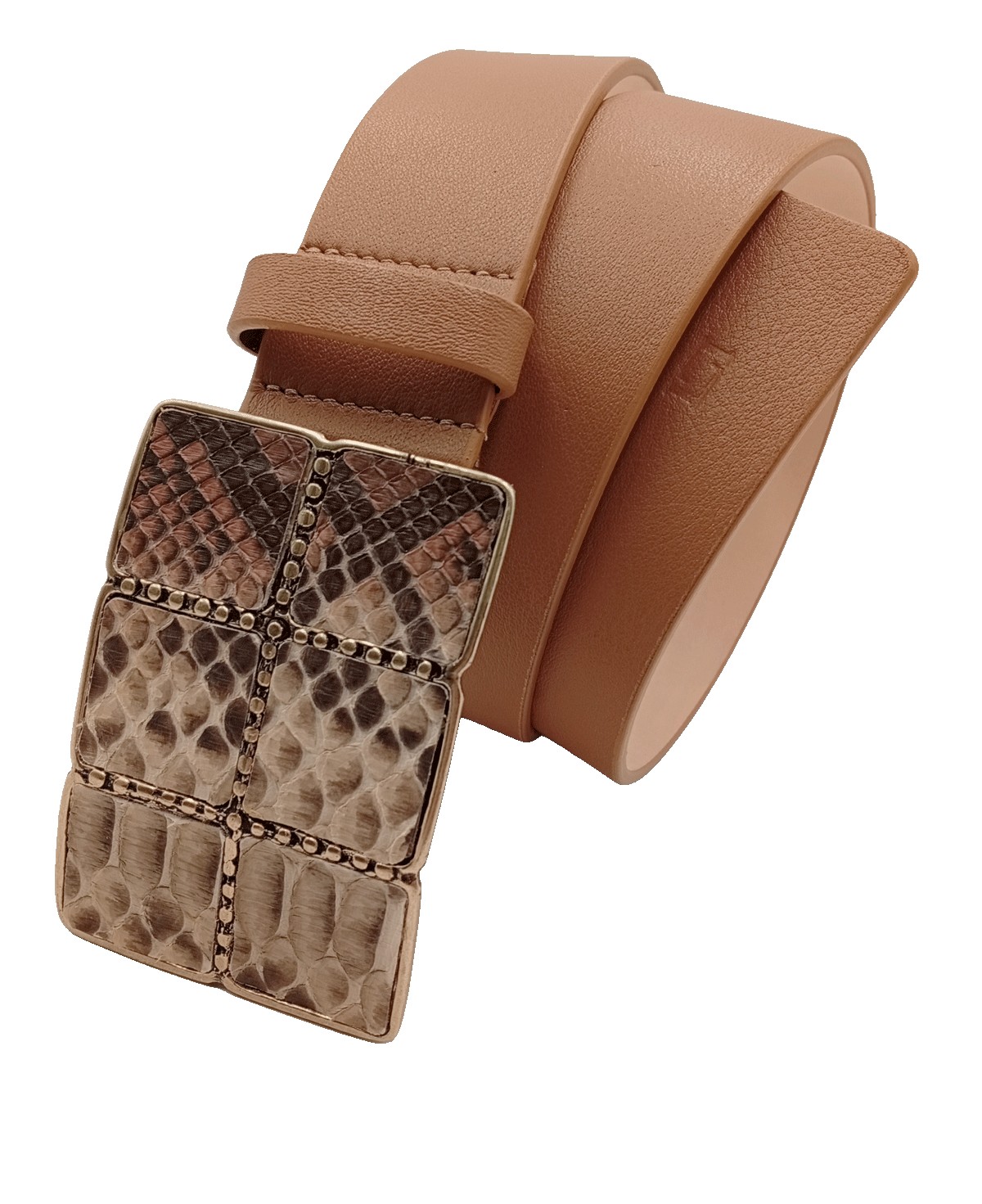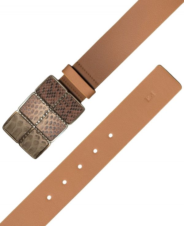 Cinturón de señora de 40mm de ancho de napa auténtica con hebilla tipo chapón con acabado en latón con incrustaciones de serpiente.