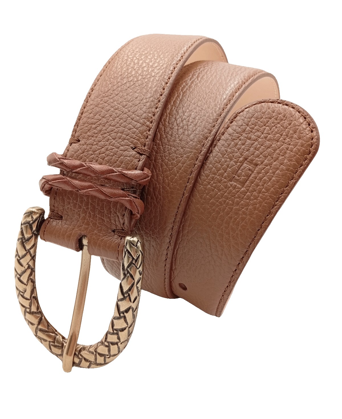 Cinturón de señora en 40 mm. de piel crispada con hebilla en acabado oro viejo brillo con diseño de trenza