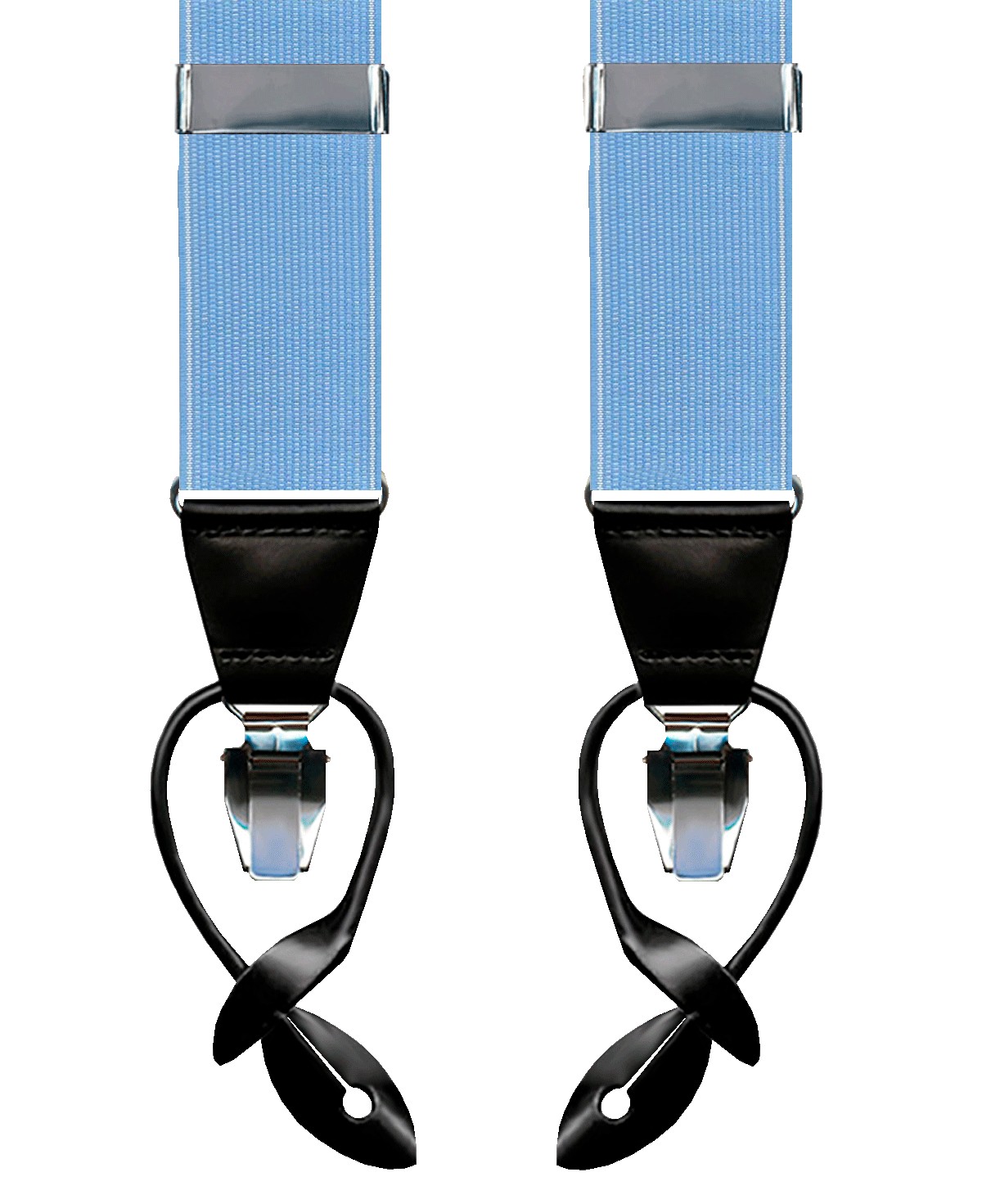 Tirantes elásticos color celeste, con sistema de cierre mediante pinza de color níquel. Este tirante elástico tiene una terminación de piel en color negro. Fabricado en España.