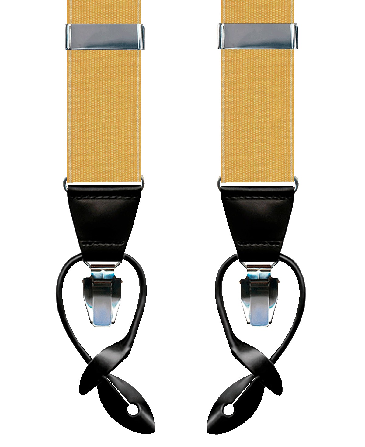 Tirantes elásticos color amarillo, con sistema de cierre mediante pinza de color níquel. Este tirante elástico tiene una terminación de piel en color negro. Fabricado en España.