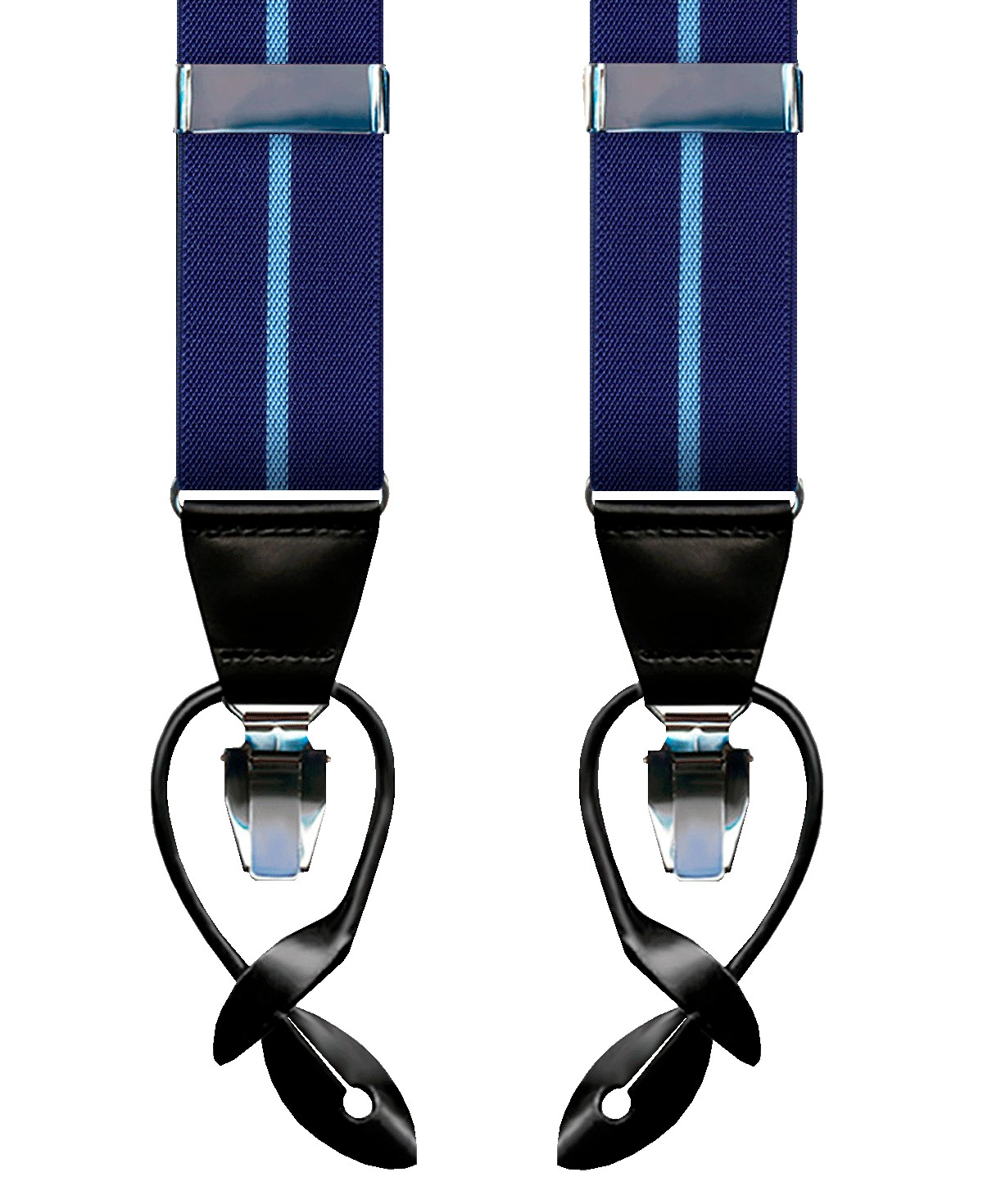 Tirantes elásticos color azul con raya celeste y sistema de cierre mediante pinza de color níquel. Este tirante elástico tiene una terminación de piel en color negro. Fabricado en España.