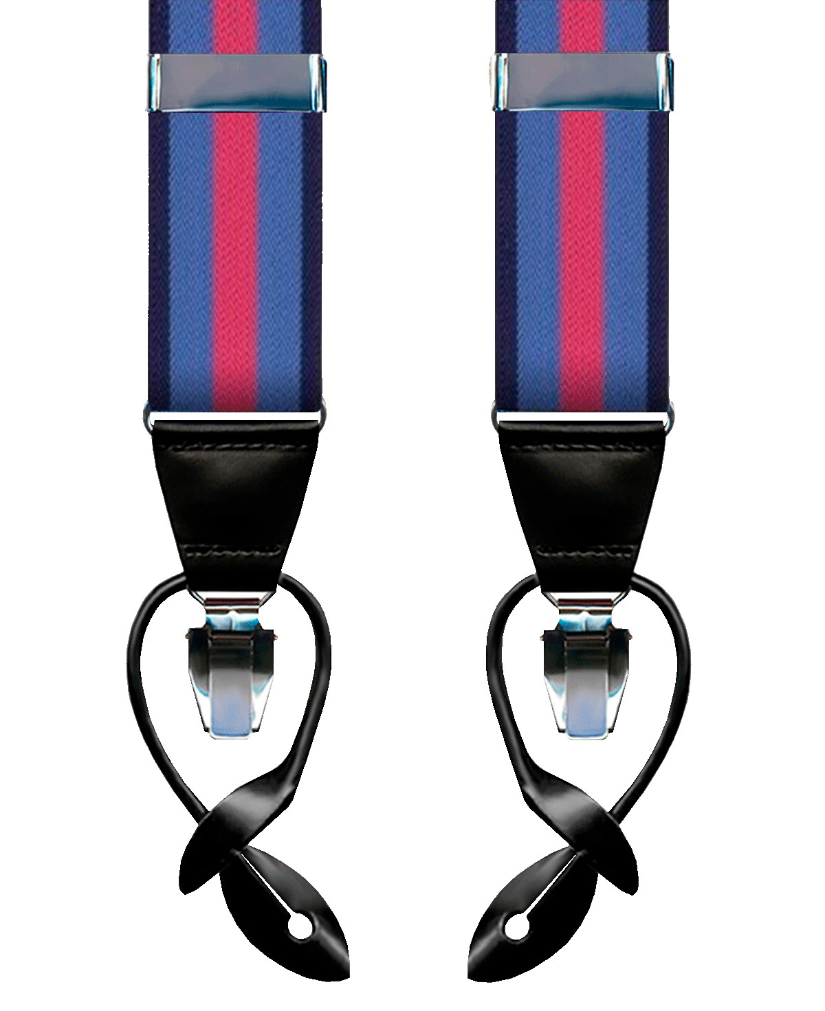 Tirantes elásticos de rayas de color marino, azul y rosa con sistema de cierre mediante pinza de color níquel. Este tirante elástico tiene una terminación de piel en color negro. Fabricado en España.