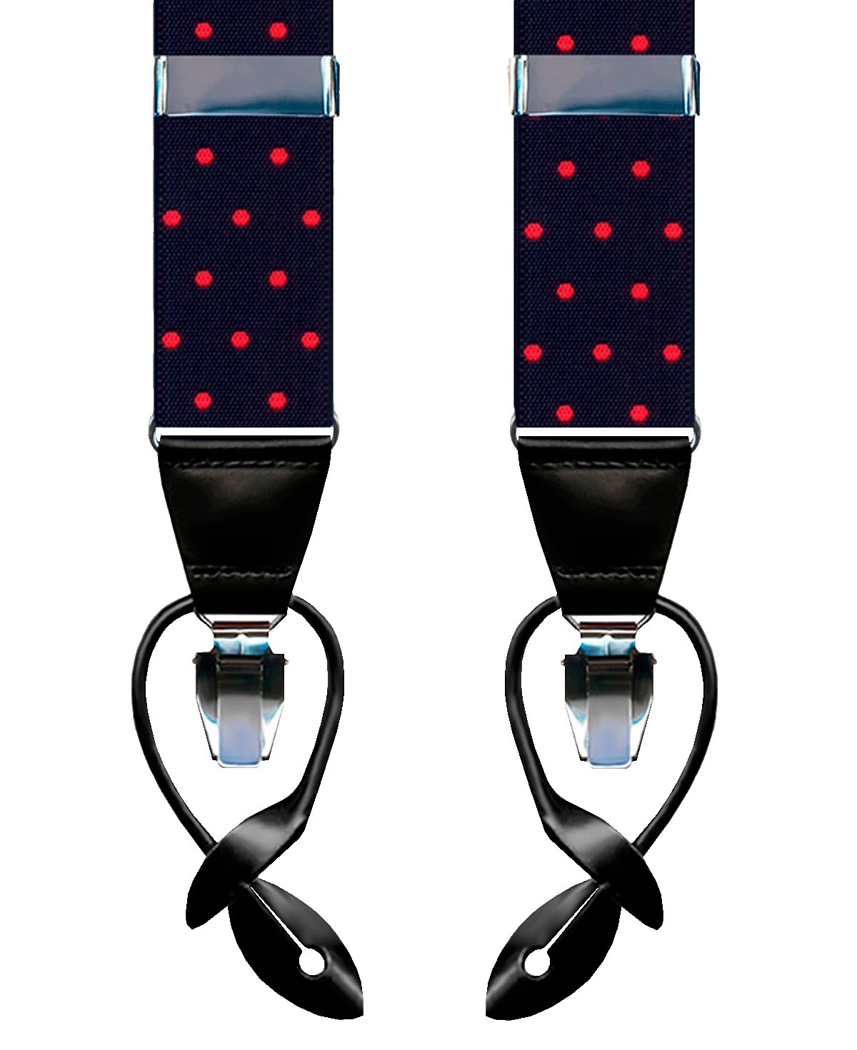 Tirantes elásticos azul marino, con sistema de cierre, mediante pinza de color níquel. Este tirante elástico tiene una terminación de piel en color negro. Fabricado en España.